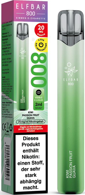 Elfbar 800 E-Shisha KIWI PASSION FRUIT GUAVA ca. 800 Züge - mit Turbo-Mode / sichtbarem Liquid / Kindersicherung, Nikotin 2ml Liquid Nikotin 20mg/ml 550mAh Einweg-Pos System TPD konform 10er T-Dsp.(mit Steuerbanderole)