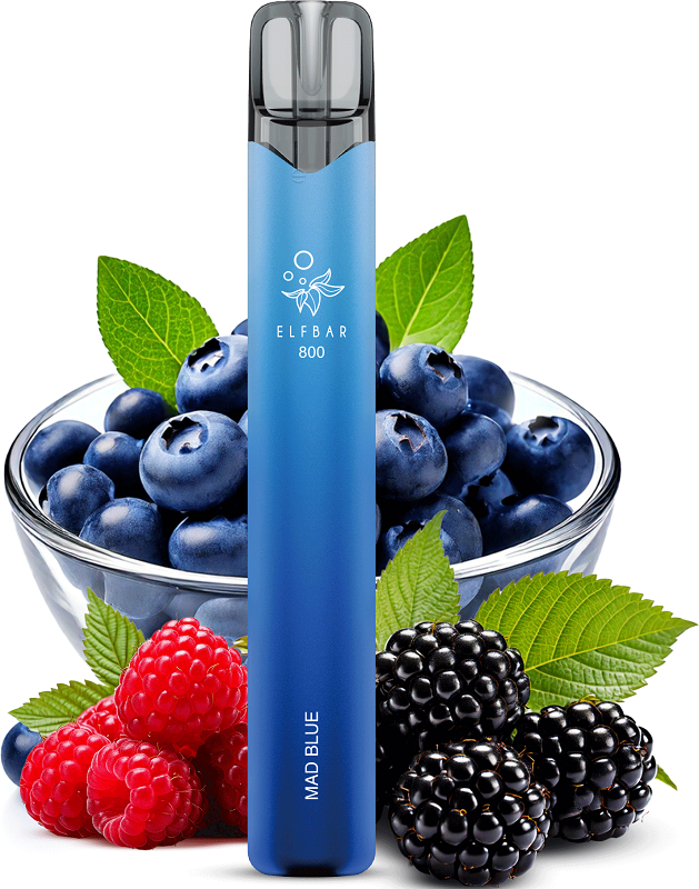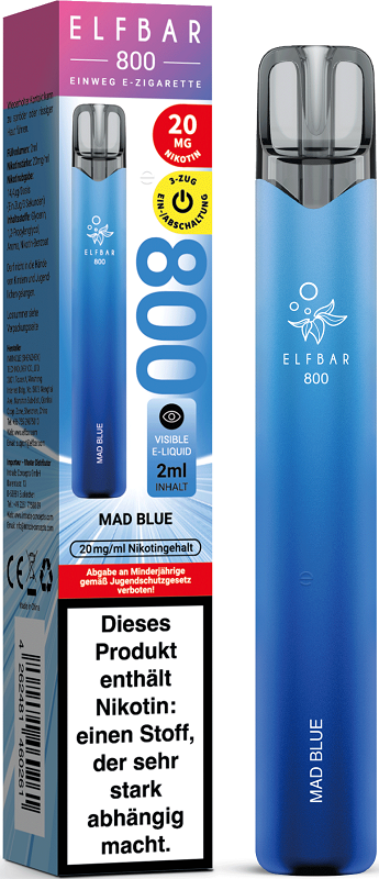 Elfbar 800 E-Shisha MAD BLUE ca. 800 Züge - mit Turbo-Mode / sichtbarem Liquid / Kindersicherung, Nikotin 2ml Liquid Nikotin 20mg/ml 550mAh Einweg-Pos System TPD konform 10er T-Dsp.(mit Steuerbanderole)