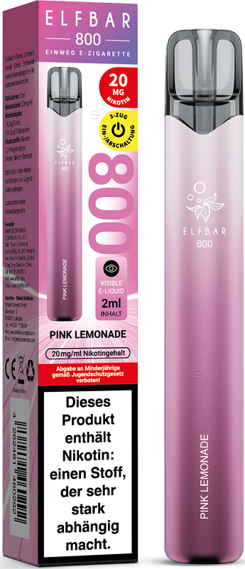 Elfbar 800 E-Shisha PINK LEMONADE ca. 800 Züge - mit Turbo-Mode / sichtbarem Liquid / Kindersicherung, Nikotin 2ml Liquid Nikotin 20mg/ml 550mAh Einweg-Pos System TPD konform 10er T-Dsp.(mit Steuerbanderole)