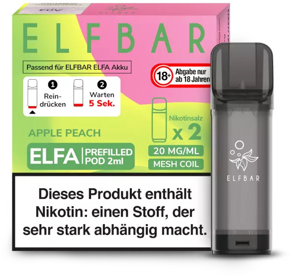 Elfbar ELFA CP Prefilled Pod APPLE PEACH ca. 600 Züge - Nikotin 2ml Liquid Nikotin 20mg/ml Prefilled-Pod System TPD konform 2er Pack in 10er T-Dsp.(kompatibel mit allen ELFA Basisgeräten)(mit Steuerbanderole)