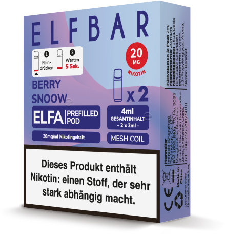 Elfbar ELFA CP Prefilled Pod BERRY SNOOW ca. 600 Züge - Nikotin 2ml Liquid Nikotin 20mg/ml Prefilled-Pod System TPD konform 2er Pack in 10er T-Dsp.(kompatibel mit allen ELFA Basisgeräten)(mit Steuerbanderole)