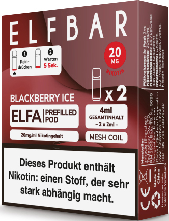 Elfbar ELFA CP Prefilled Pod BLACKBERRY ICE ca. 600 Züge - Nikotin 2ml Liquid Nikotin 20mg/ml Prefilled-Pod System TPD konform 2er Pack in 10er T-Dsp.(kompatibel mit allen ELFA Basisgeräten)(mit Steuerbanderole)