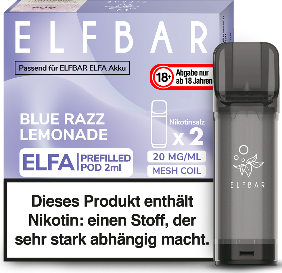 Elfbar ELFA CP Prefilled Pod BLUE RAZZ LEMONADE ca. 600 Züge - Nikotin 2ml Liquid Nikotin 20mg/ml Prefilled-Pod System TPD konform 2er Pack in 10er T-Dsp.(kompatibel mit allen ELFA Basisgeräten)(mit Steuerbanderole)