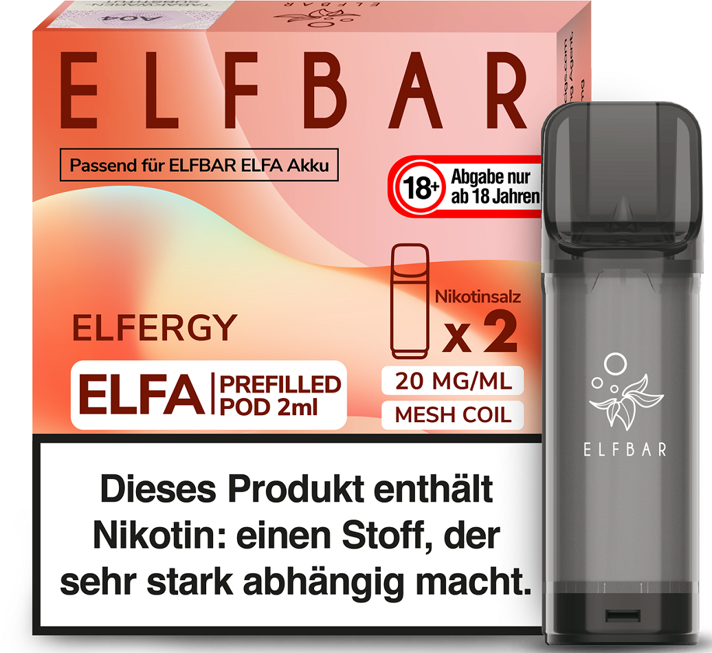 Elfbar ELFA CP Prefilled Pod ELFERGY ca. 600 Züge - Nikotin 2ml Liquid Nikotin 20mg/ml Prefilled-Pod System TPD konform 2er Pack in 10er T-Dsp.(kompatibel mit allen ELFA Basisgeräten)(mit Steuerbanderole)