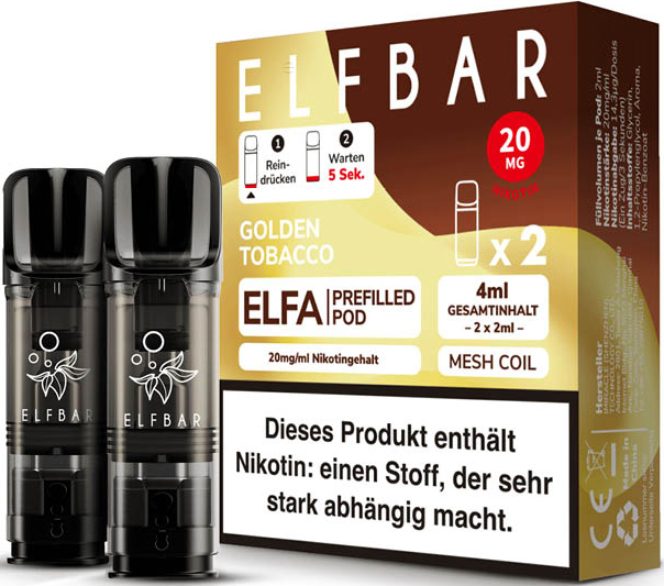 Elfbar ELFA CP Prefilled Pod GOLDEN TOBACCO ca. 600 Züge - Nikotin 2ml Liquid Nikotin 20mg/ml Prefilled-Pod System TPD konform 2er Pack in 10er T-Dsp.(kompatibel mit allen ELFA Basisgeräten)(mit Steuerbanderole)
