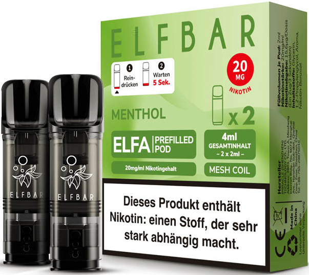 Elfbar ELFA CP Prefilled Pod MENTHOL ca. 600 Züge - Nikotin 2ml Liquid Nikotin 20mg/ml Prefilled-Pod System TPD konform 2er Pack in 10er T-Dsp.(kompatibel mit allen ELFA Basisgeräten)(mit Steuerbanderole)