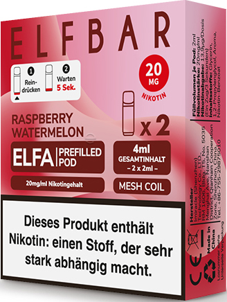 Elfbar ELFA CP Prefilled Pod RASPBERRY WATERMELON ca. 600 Züge - Nikotin 2ml Liquid Nikotin 20mg/ml Prefilled-Pod System TPD konform 2er Pack in 10er T-Dsp.(kompatibel mit allen ELFA Basisgeräten)(mit Steuerbanderole)