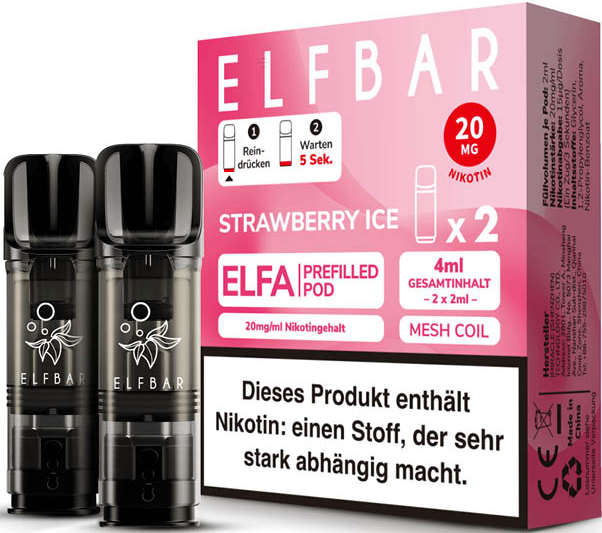 Elfbar ELFA CP Prefilled Pod STRAWBERRY ICE ca. 600 Züge - Nikotin 2ml Liquid Nikotin 20mg/ml Prefilled-Pod System TPD konform 2er Pack in 10er T-Dsp.(kompatibel mit allen ELFA Basisgeräten)(mit Steuerbanderole)