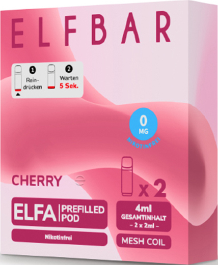 Elfbar ELFA CP Prefilled Pod CHERRY ca. 600 Züge - ohne Nikotin 2ml Liquid Nikotin 0mg/ml Prefilled-Pod System TPD konform 2er Pack in 10er T-Dsp.(kompatibel mit allen ELFA Basisgeräten)(mit Steuerbanderole)