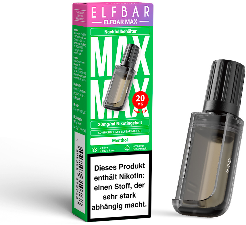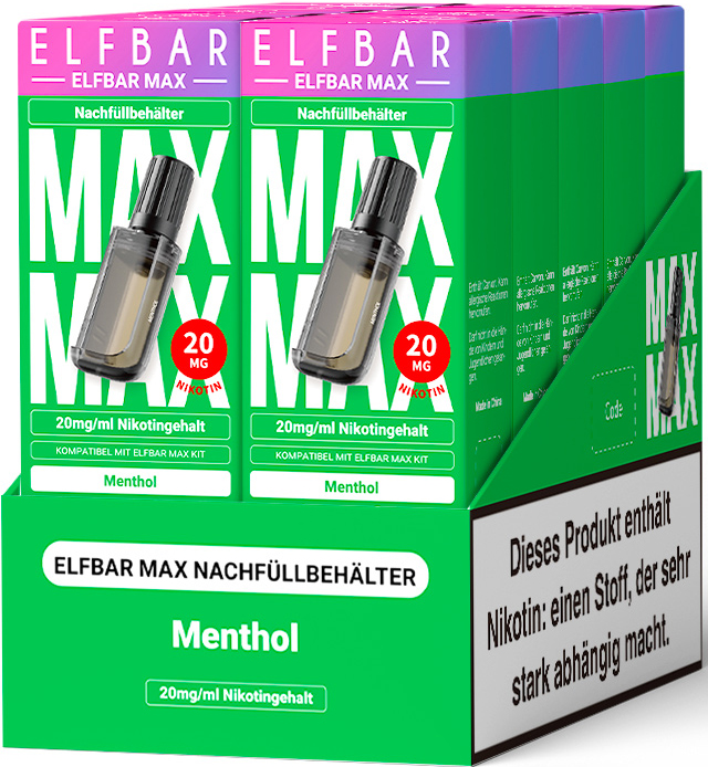 Elfbar MAX Prefilled Pod MENTHOL ca. 6000 Züge - Nikotin 10ml Liquid Nikotin 20mg/ml Prefilled-Pod System TPD konform im 10er T-Dsp.(kompatibel mit allen Efbar MAX Basisgeräten)(mit Steuerbanderole)