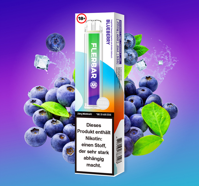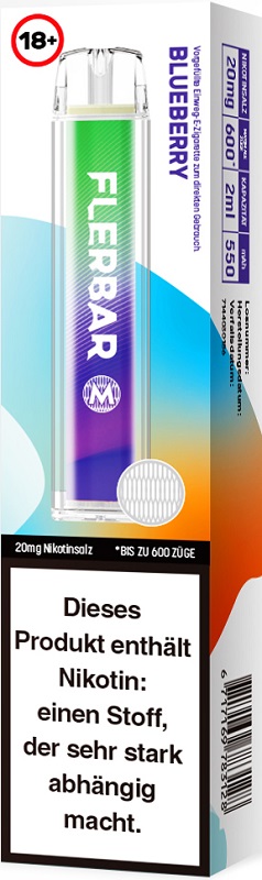 Flerbar M 600 E-Shisha BLUEBERRY ca. 600 Züge - mit Kindersicherung, Nikotin 2ml Liquid Nikotin 20mg/ml 550mAh Einweg-Pos System TPD konform 10er T-Dsp.(mit Steuerbanderole)