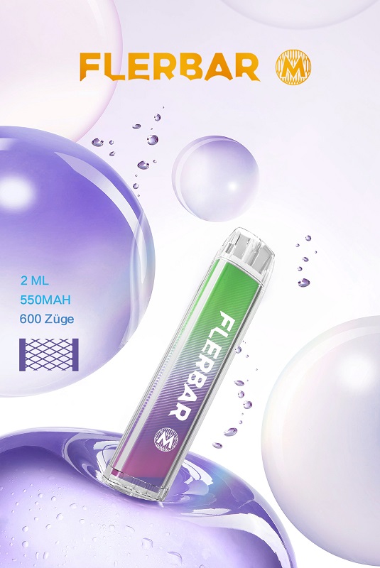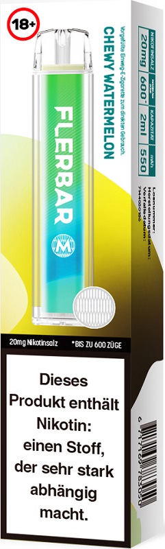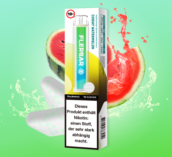 Flerbar M 600 E-Shisha CHEWY WATERMELON ca. 600 Züge - mit Kindersicherung, Nikotin 2ml Liquid Nikotin 20mg/ml 550mAh Einweg-Pos System TPD konform 10er T-Dsp.(mit Steuerbanderole)
