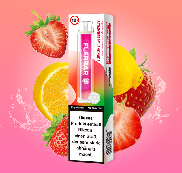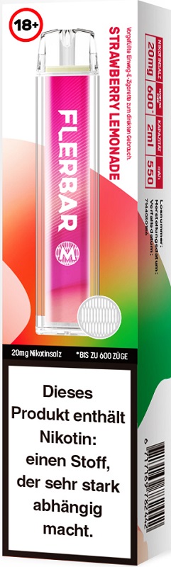 Flerbar M 600 E-Shisha STRAWBERRY LEMONADE ca. 600 Züge - mit Kindersicherung, Nikotin 2ml Liquid Nikotin 20mg/ml 550mAh Einweg-Pos System TPD konform 10er T-Dsp.(mit Steuerbanderole)