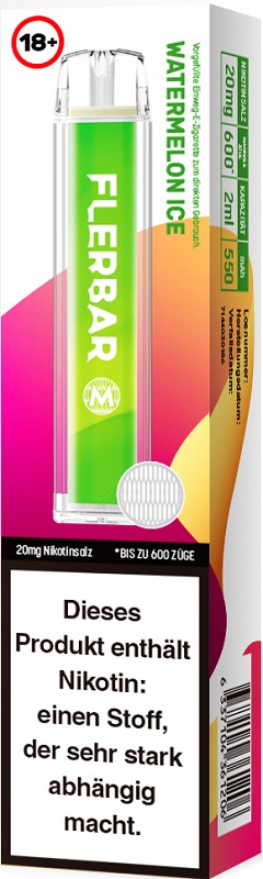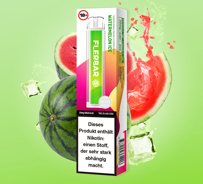 Flerbar M 600 E-Shisha WATERMELON ICE ca. 600 Züge - mit Kindersicherung, Nikotin 2ml Liquid Nikotin 20mg/ml 550mAh Einweg-Pos System TPD konform 10er T-Dsp.(mit Steuerbanderole)