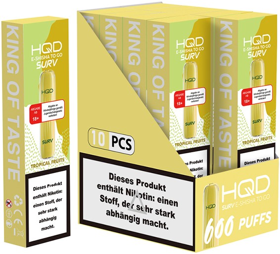 HQD SURV E-Shisha MAMBO ehem. Tropical Fruits (tropische Früchte) - Nikotin 2ml Liquid Nikotin 20mg/ml ca. 600 Züge 400mAh Einweg-Pos System TPD konform 10er T-Dsp.(mit Steuerbanderole)