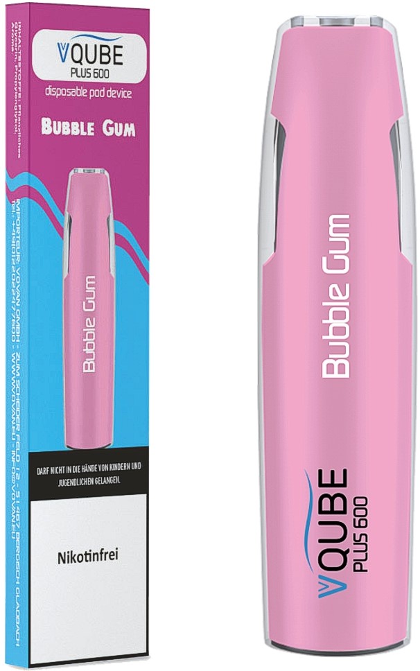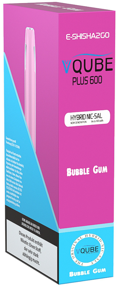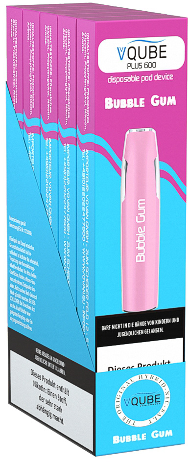 Vovan Vqube Plus600 E-Shisha BUBBLE GUM - Nikotin 2ml Liquid Nic-Salt 16mg/ml ca. 600 Züge 400mAh Einweg-Pos System TPD konform 5er T-Dsp.(mit Steuerbanderole)