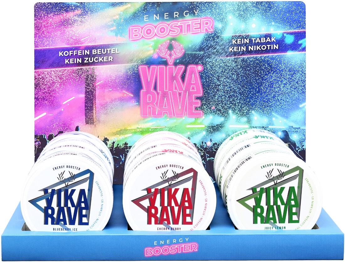 Vika Rave MIX Thekendsp. - 3/s 80mg Koffein & 3mg B5 Vitamin je Beutel (je 5x á 20 Beutel: Bold Cinnamon, Strawberry Ice, Double Mint) im 15er T-Dsp.